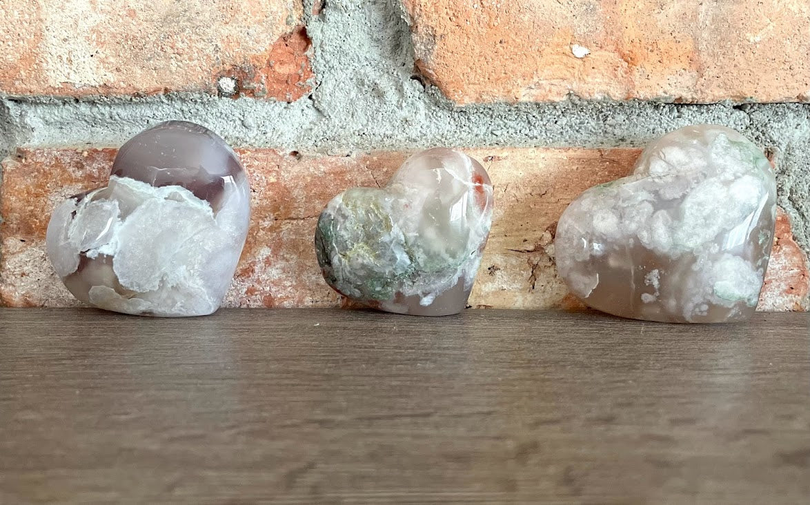 These are beautifully patterned flower agate hearts. Some hearts have inclusions of red or green in their patterning. One is even completely white! They may have natural druzy or caverning.