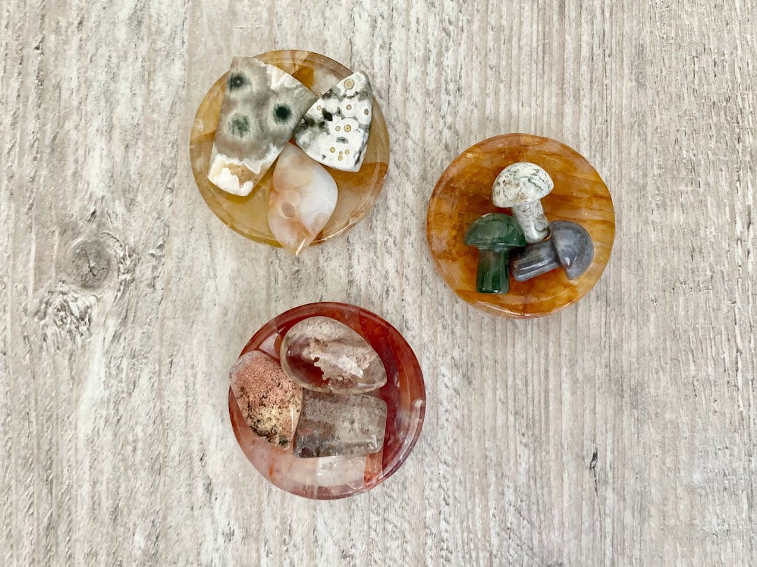 Golden healer and fire quartz trinket dishes are perfect for featuring a few small crystals or holding rings or other jewelry, among endless other possibilities!