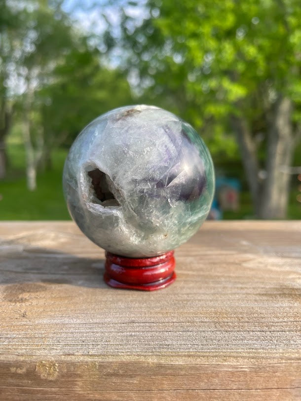 This perfectly sized fluorite sphere features beautiful rainbow patterning, along with the inclusion of multiple druzy caverns. This sphere certainly doesn't lack interest with it's abundance of flash and sparkle!!